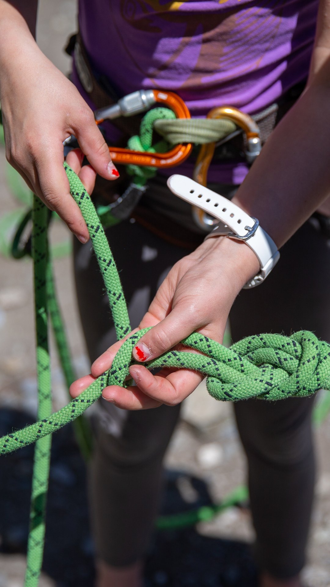 - le matériel technique : baudrier, casque, mousquetons, système d'assurage, corde