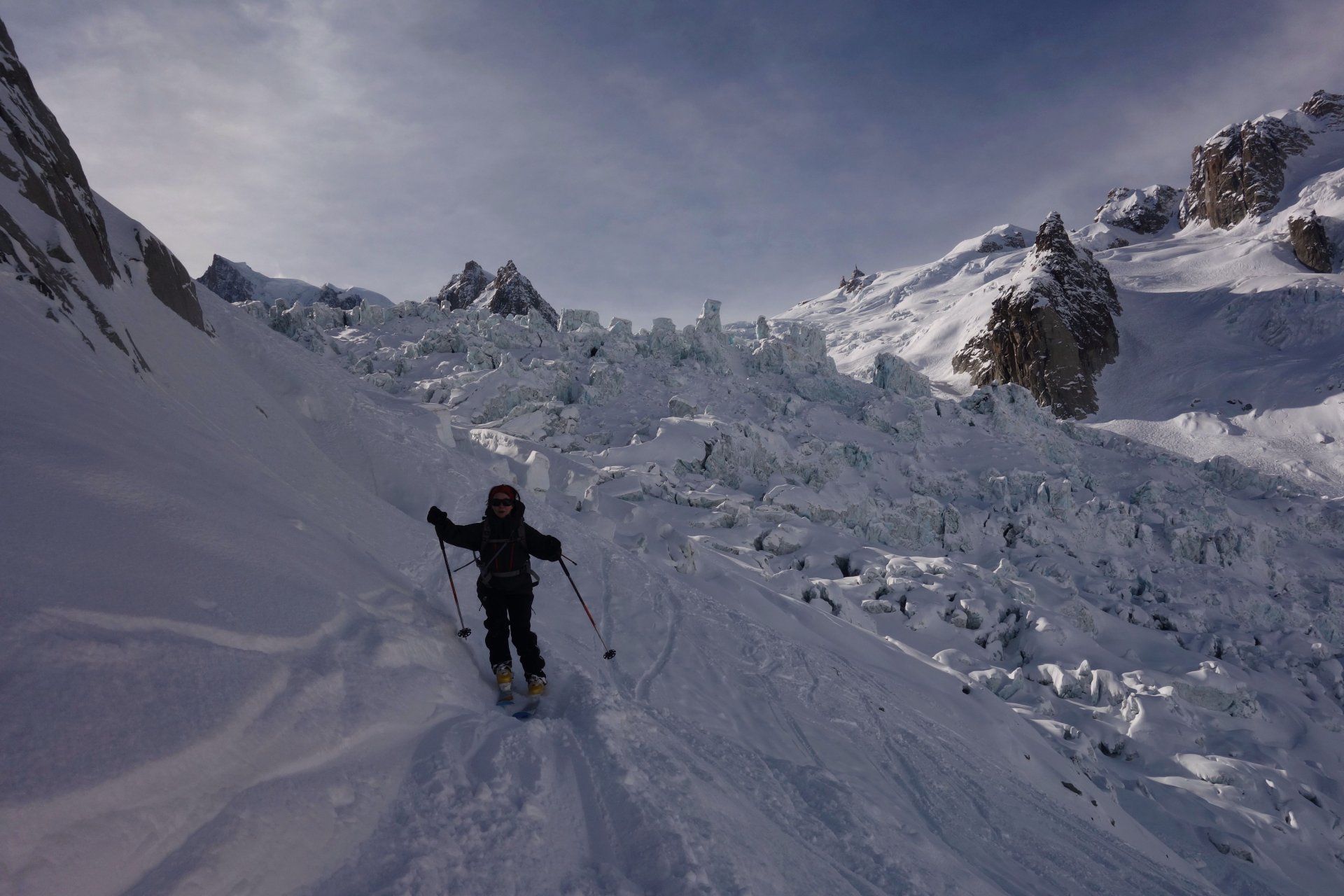 Nous débutons notre journée en continuant la descente de la Vallée Blanche jusqu’à l’intersection avec le Glacier de Leschaux. Nous y mettons les peaux et nous commençons notre montée vers la face nord des Grandes Jorasses. Nous passons au pied du refuge de Leschaux et nous nous arrêtons vers 2 700m. Les Grandes Jorasses sont toutes proches ! Vous pouvez vous imprégnez de l’atmosphère très particulière qu’elles dégagent et vous mettre dans la peau des alpinistes qui les gravissent. Descente en pente douce pour rejoindre la Vallée Blanche. En fonction de l’enneigement, nous skions jusqu’à Chamonix ou nous nous arrêtons au train du Montenvers.